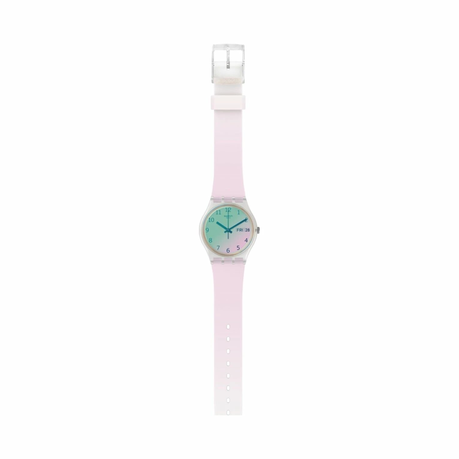 L’ULTRAROSE (GE714) prend une allure résolument féminine avec son bracelet semi-transparent relevé d’une jolie couleur rose. Son cadran blanc à imprimé gris est orné du verre Swatch Solar Spectrum rose.